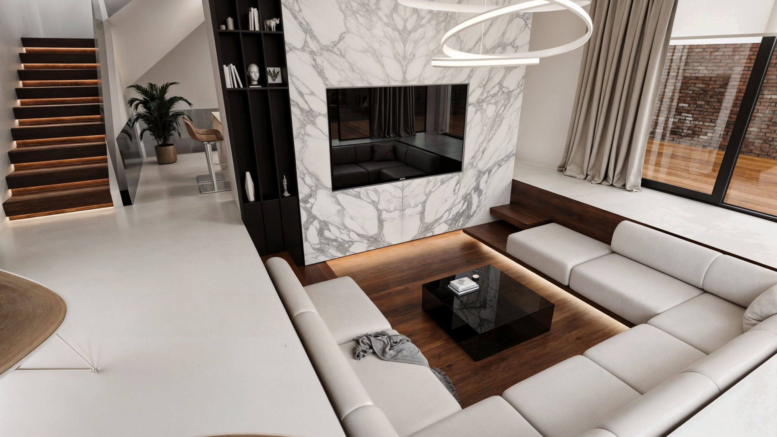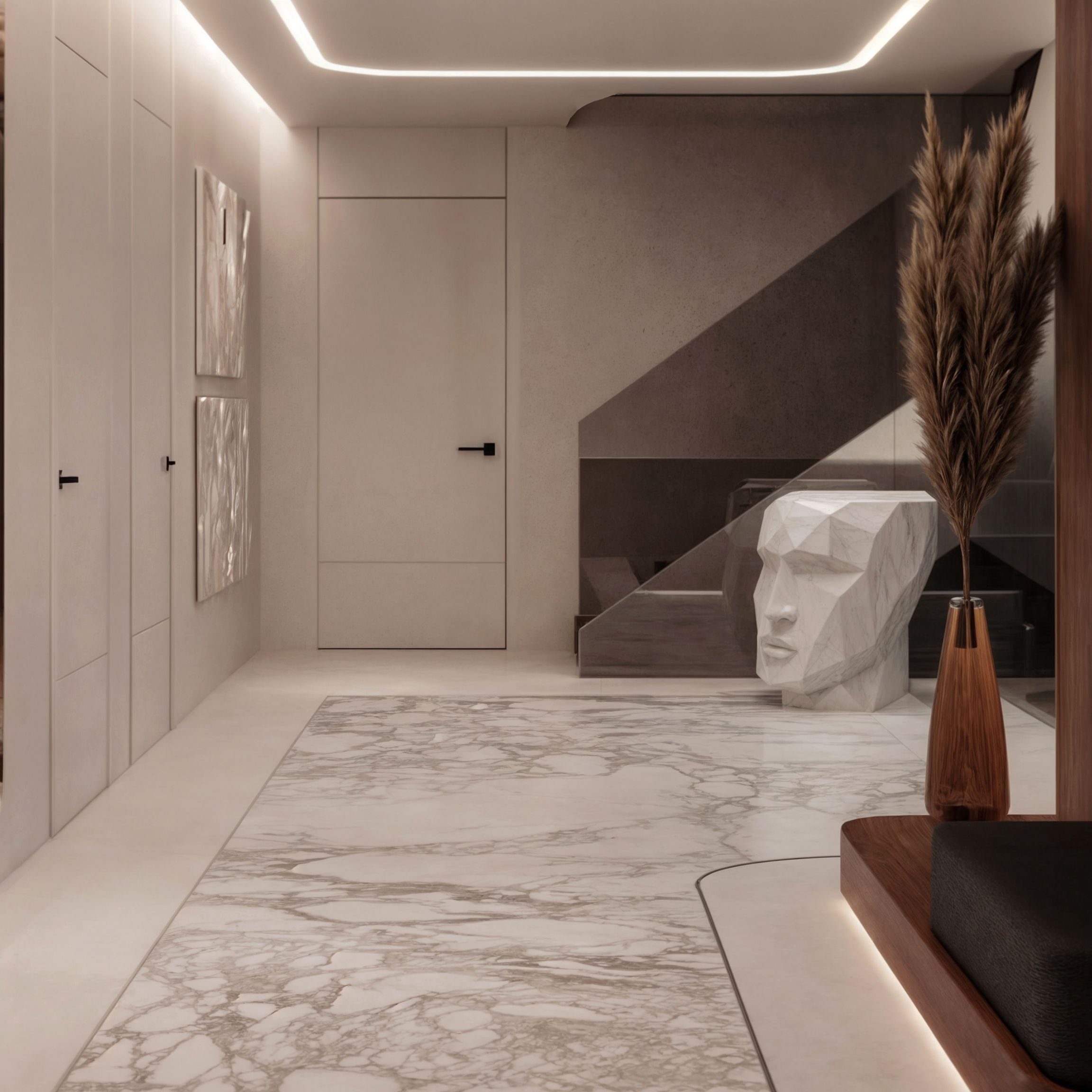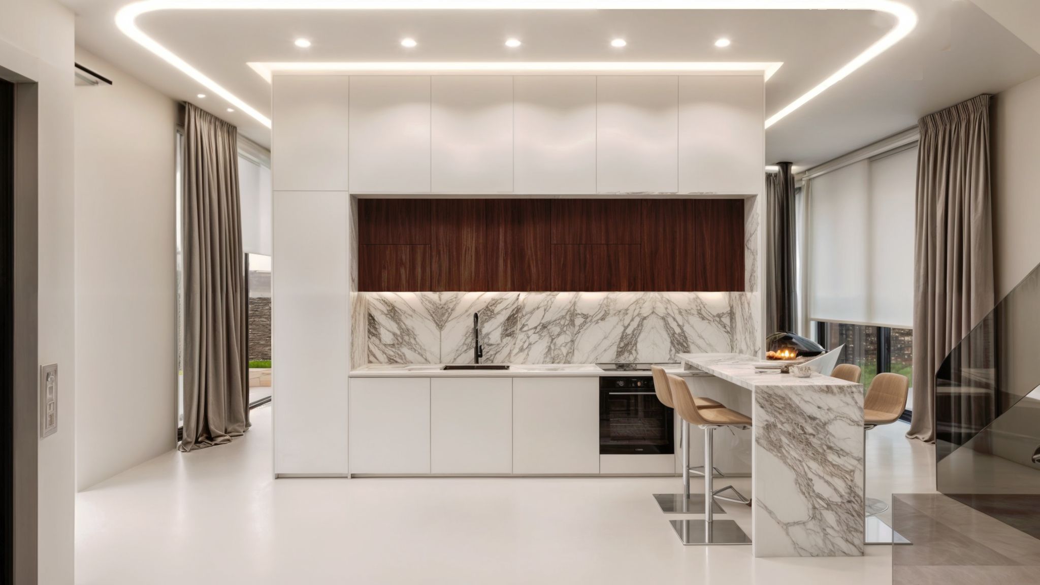We took over villa project in a beautiful location in a detached neighborhood of Ataşehir after the rough construction was completed. We completed our interior architecture project, which we designed and implemented. We provided luxury and modernity at the same time with wood and marble contrast details in the design, where we provided curvilinear forms and soft transitions.
