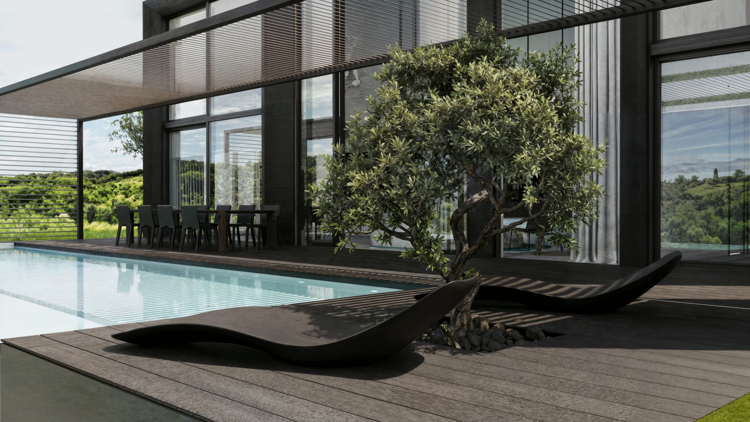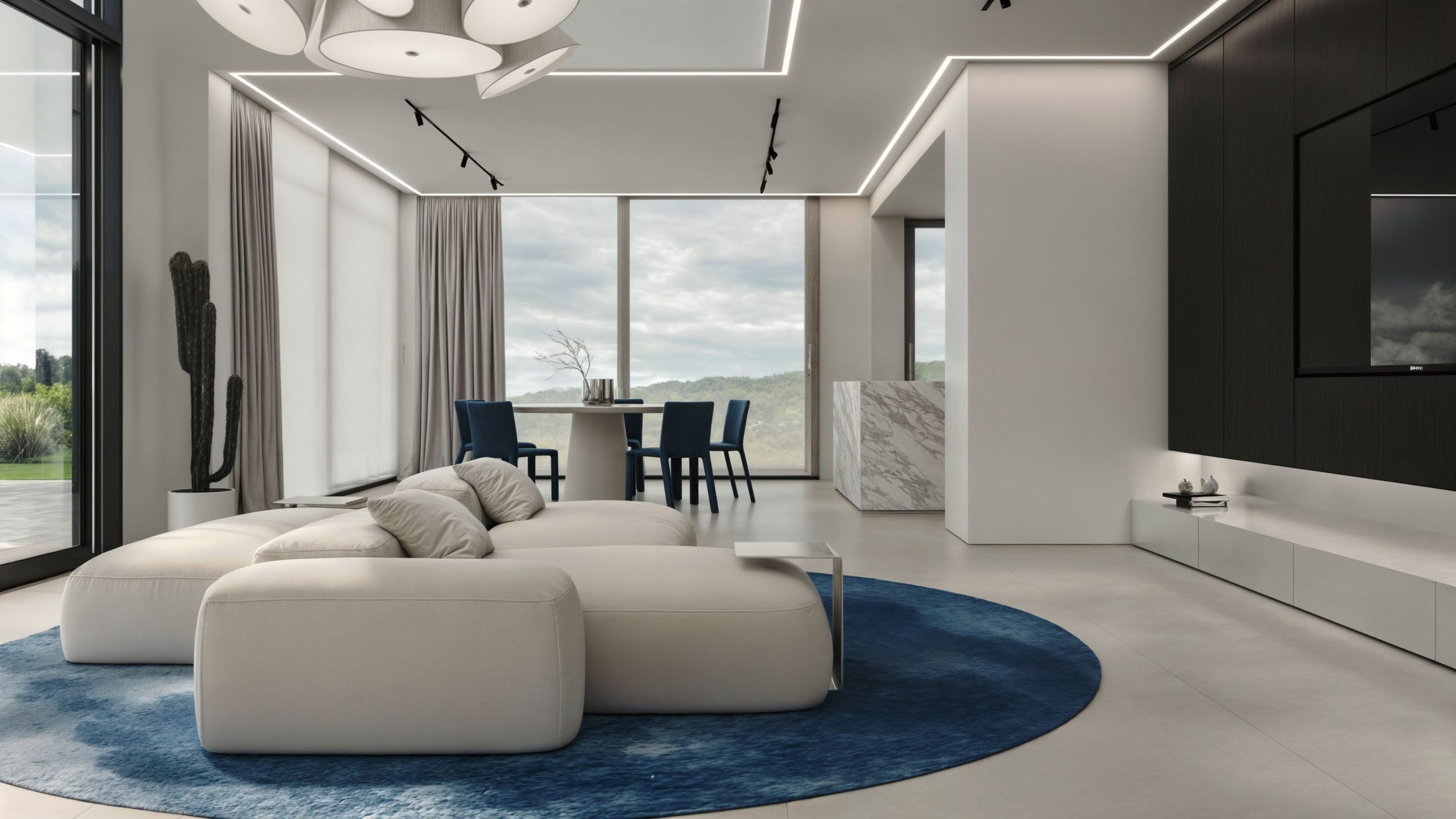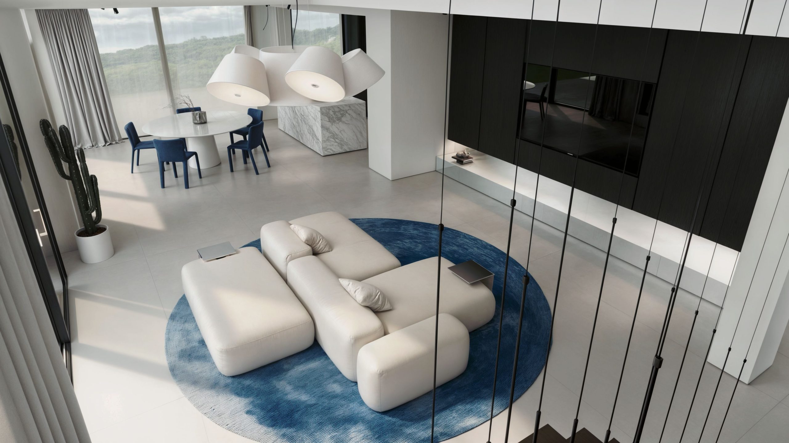 Throughout the entire villa, carefully placed blue accents highlight the concept, bringing rhythm, character, and a sense of uniqueness to the design.