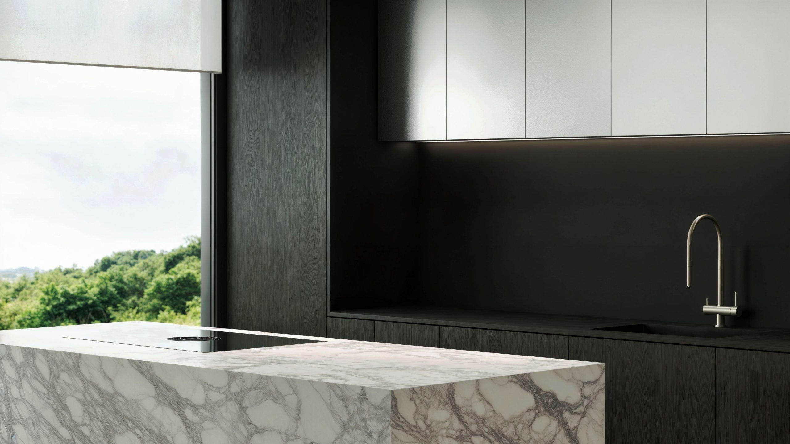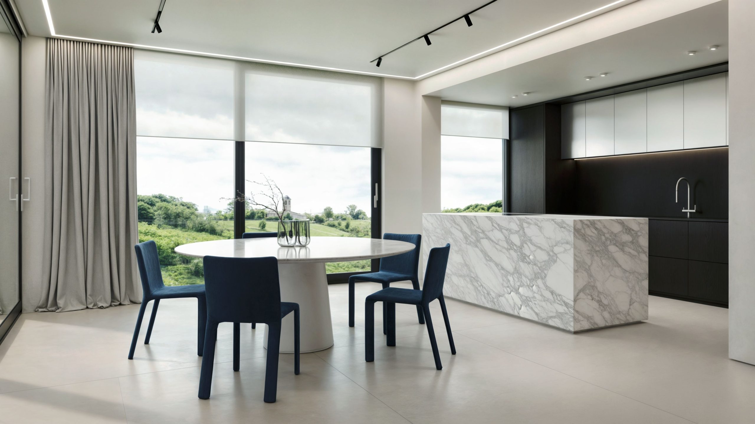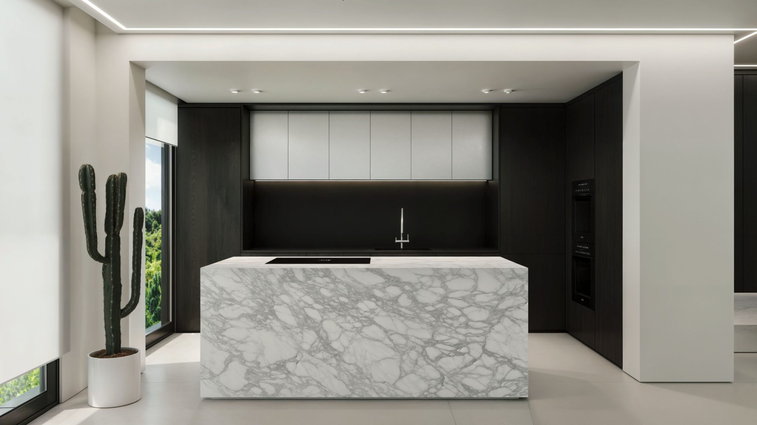In the kitchen and living areas, minimal volumes create a clean, functional, and elegant atmosphere offering both timeless aesthetics and everyday practicality.