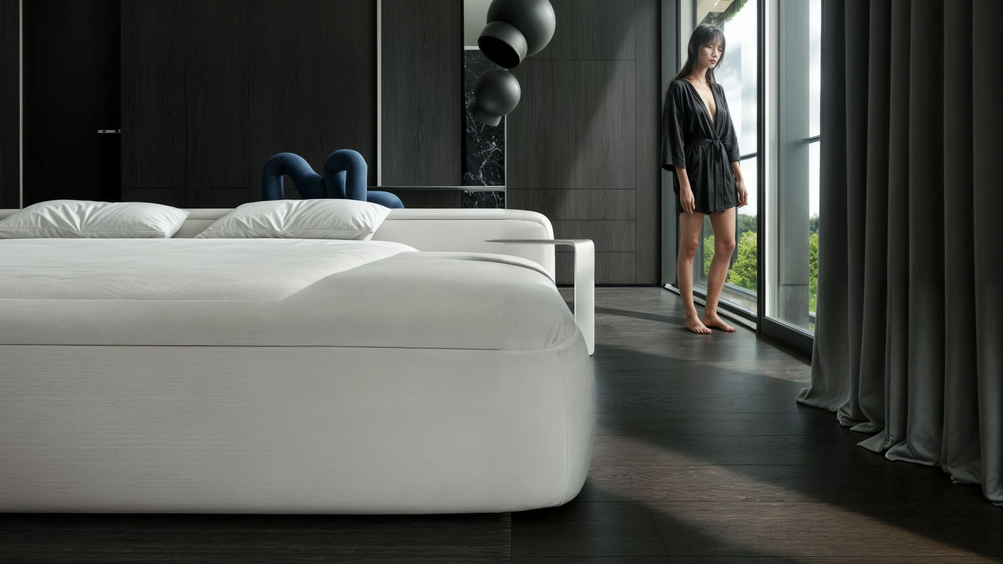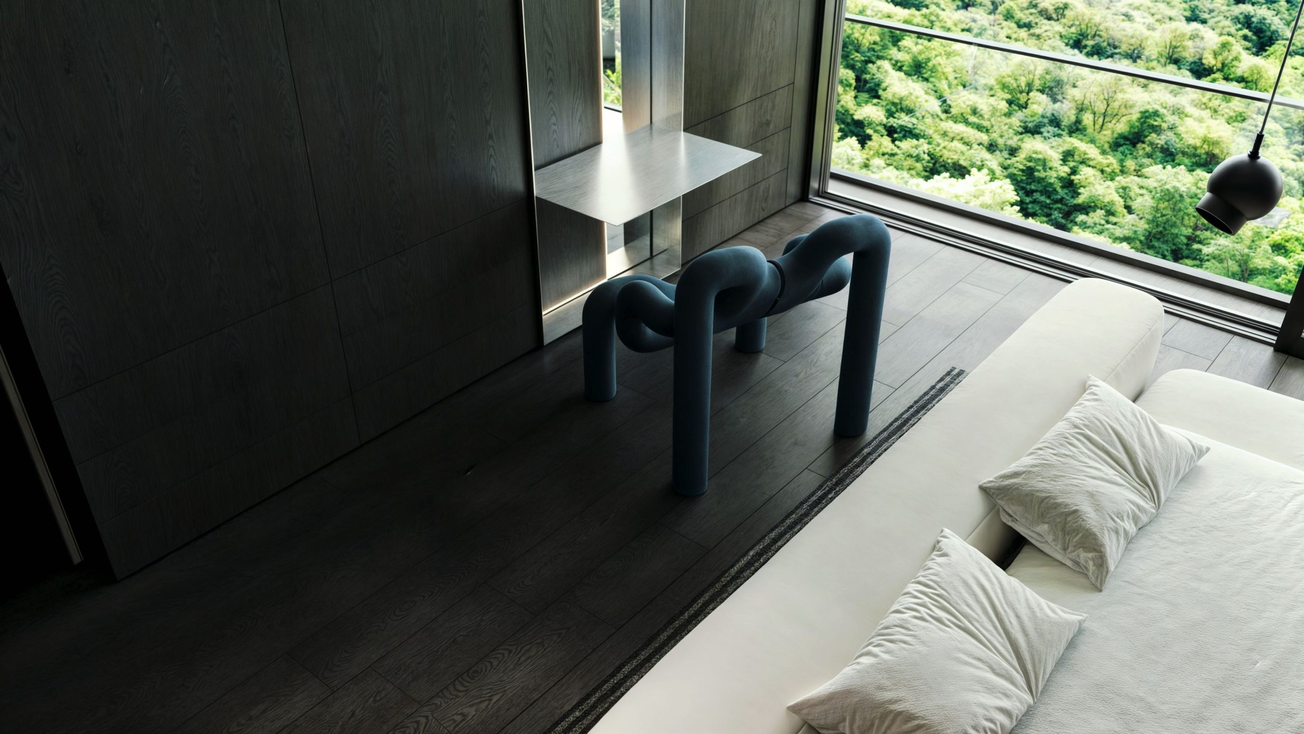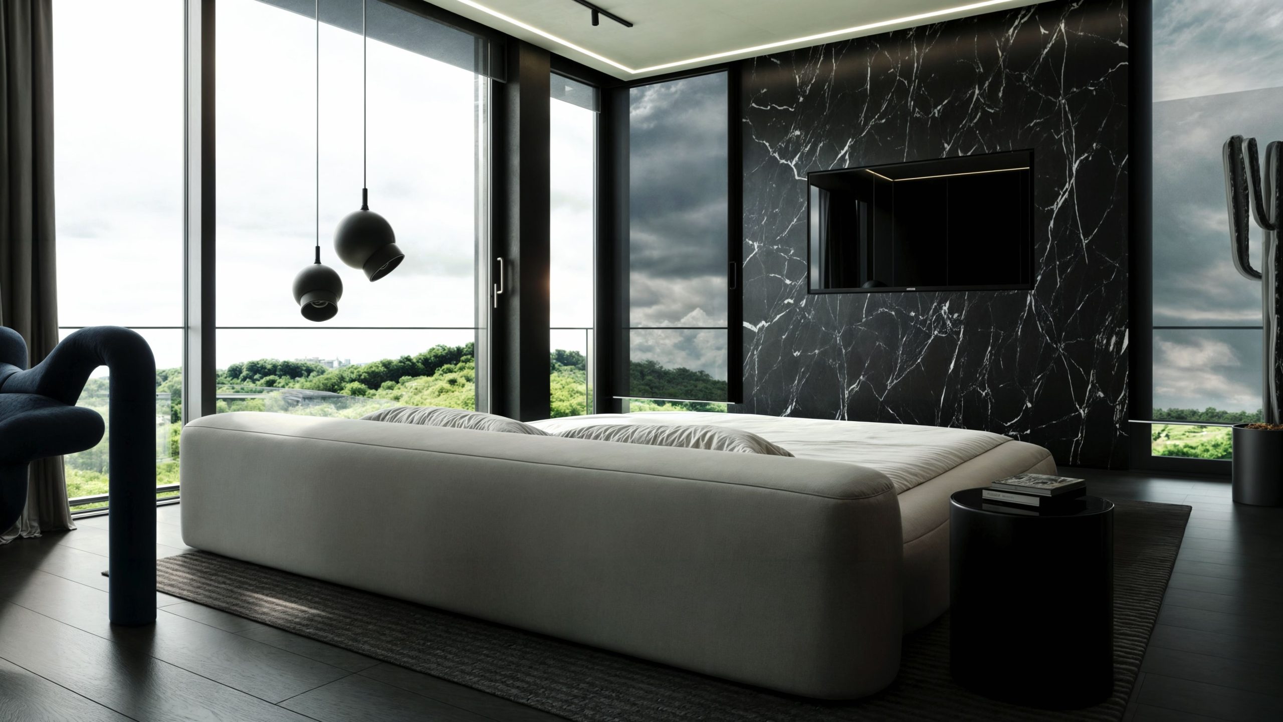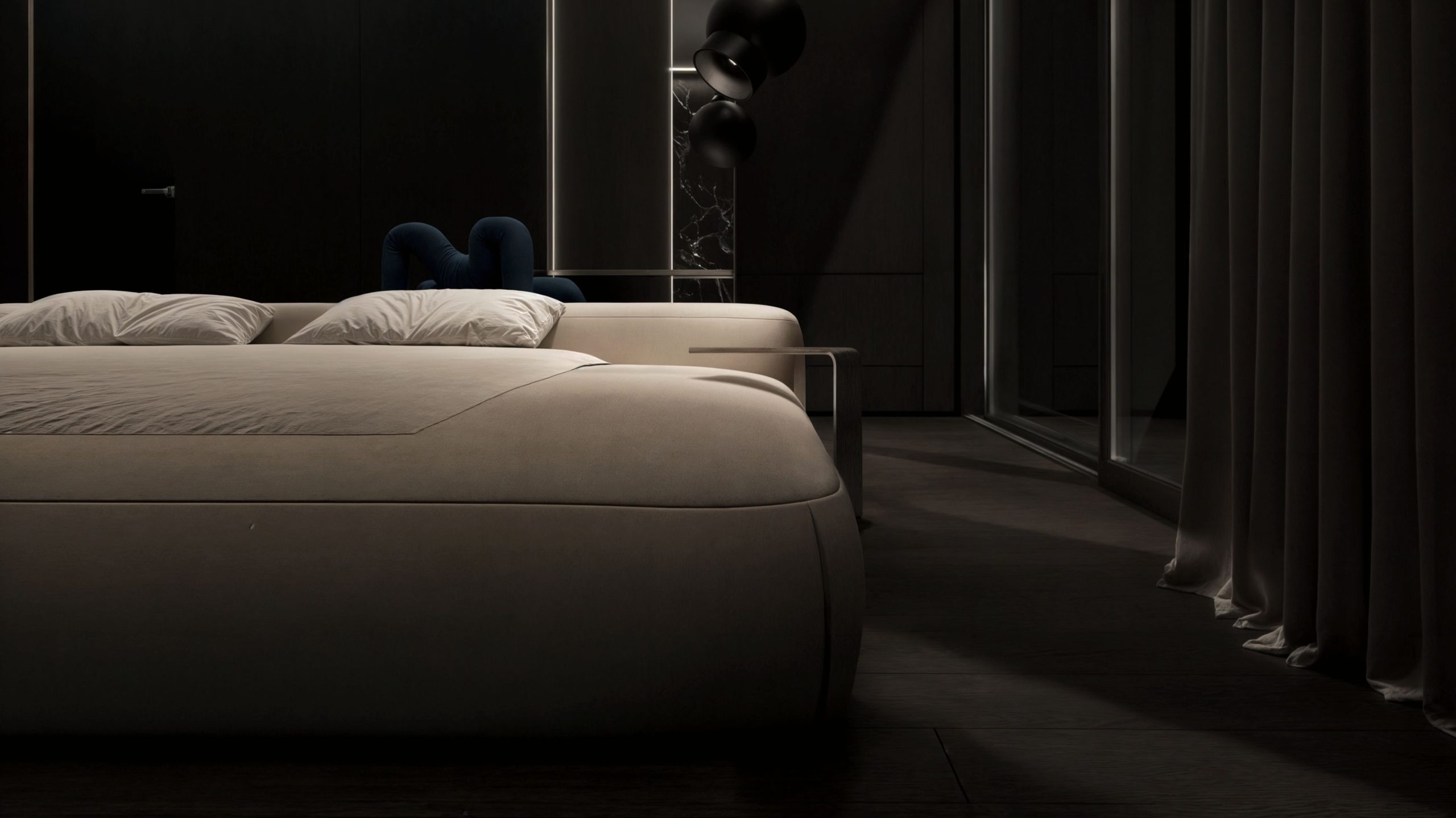 As the design narrative moves into the bedroom, the atmosphere shifts the warm and inviting effect of dark tones comes to the forefront, adding intimacy and tranquility to the private space.