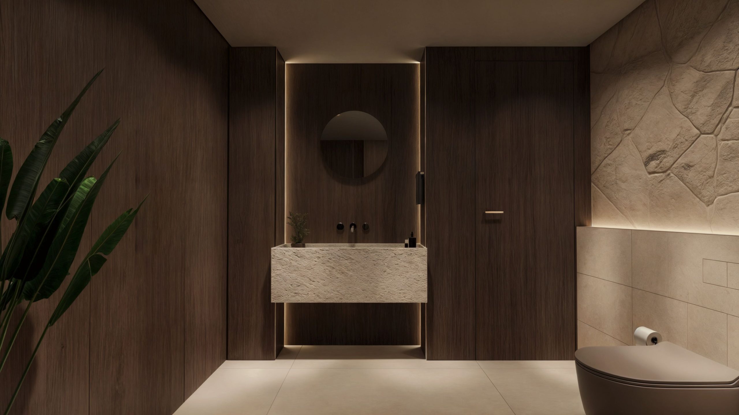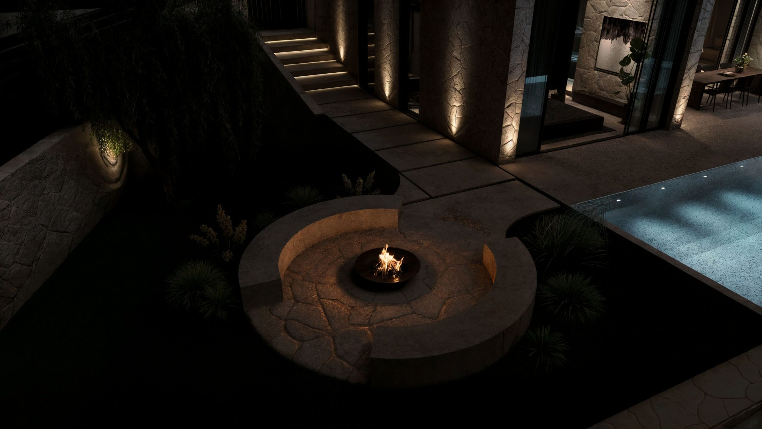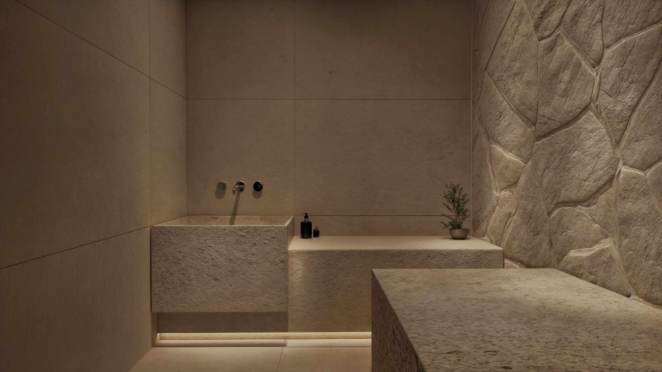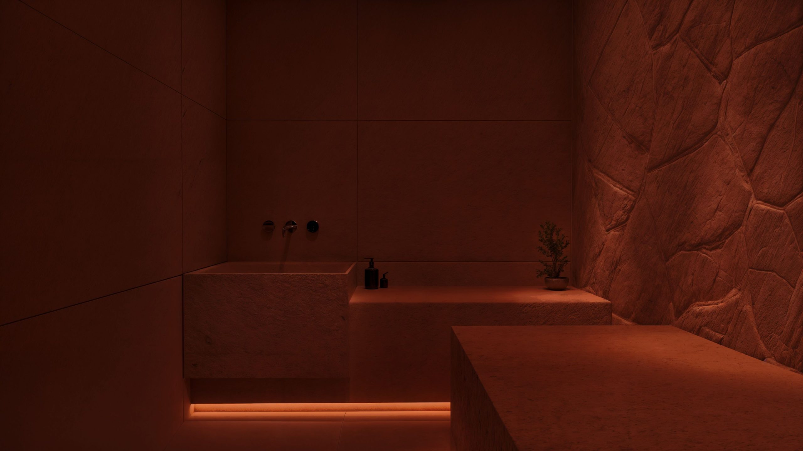 In the bathroom and turkish bath, bespoke travertine washbasins, basins, and central stones were crafted using distinctive materials native to the Aegean region, preserving the villa’s natural character. Complemented by colored lighting options, the space offers a romantic and softly lit ambiance.